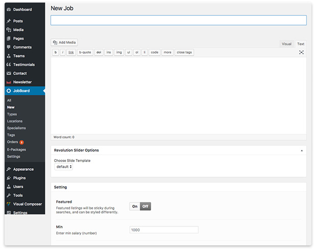 Both Administrators and Employers are able to add new jobs. Admins add jobs via the back-end in WordPress and Employers add them via the front-end section in the Employers profile dashboard.